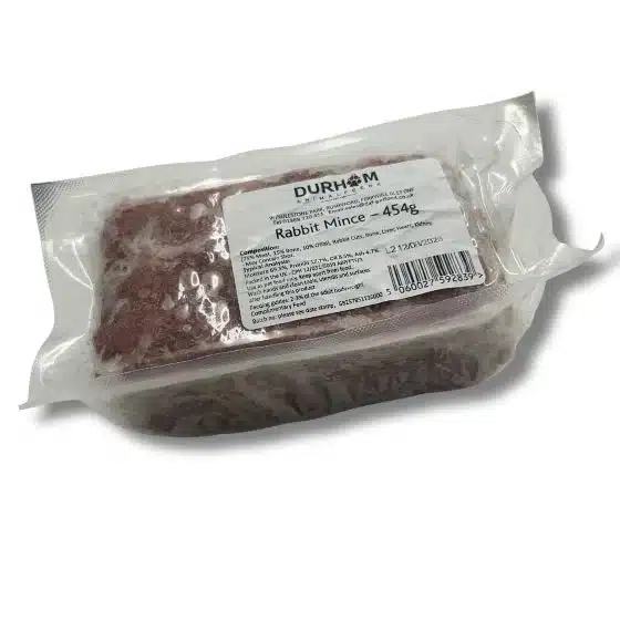 Rabbit MInce with 75% meat, 15% bone and 10% offal. Free from artificial colours, flavours and preservatives.