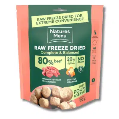 Freeze-drying removes almost all the water content without cooking and locks in nutrients and flavours. The Complete & Balanced 80/20 Freeze Dried range is created and approved the Natures Menu in-house experts and is made to strict FEDIAF guidelines.