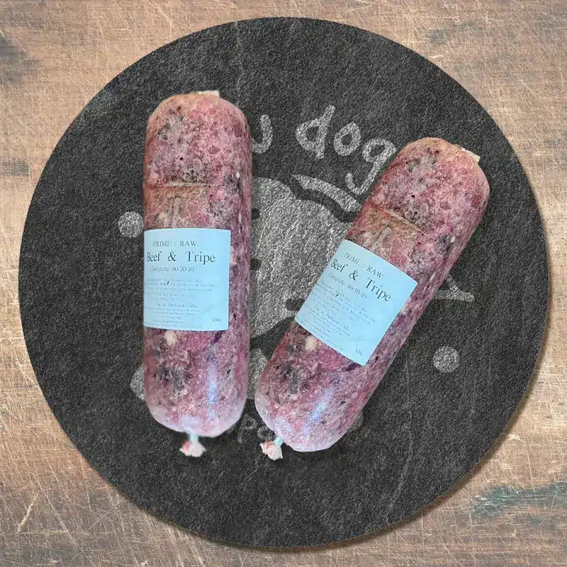 Beef and tripe complete mince with 80% beef cuts with tripe, of which may be either fresh British beef tripe or lamb tripe, 10% chicken bone and 10% offal content, of which is kidney and liver.